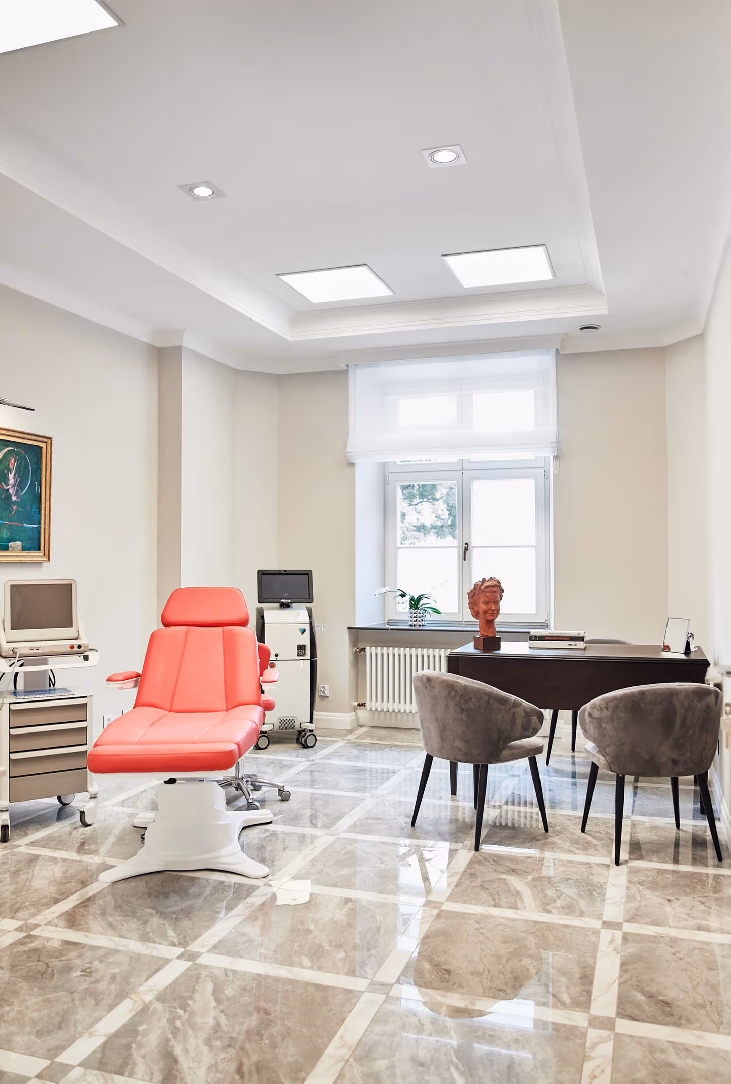 Gabinet lekarski stworzony z myślą o precyzyjnych procedurach i indywidualnym podejściu. Jasna, elegancka przestrzeń sprzyja koncentracji i profesjonalnej opiece medycznej.